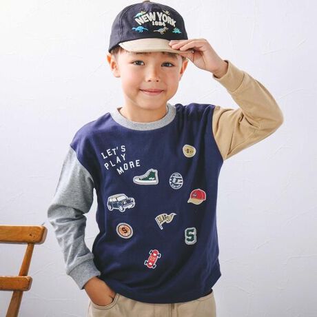 恐竜はたらくくるまプリント&ワッペンギュギュっとモチーフ袖配色Tシャツ(80~130cm)