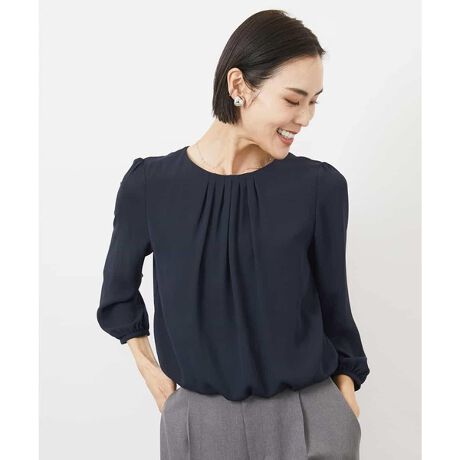 お仕事用として、ジャケットのインナーに最適なブラウソー。カーディガンのインナーとしてもおすすめです。胸元のプリーツデザインが上品かつ華やかな印象でセレモニー用としても着用いただけます。