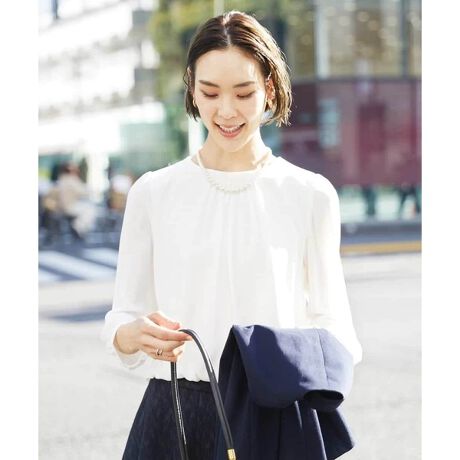 お仕事用として、ジャケットのインナーに最適なブラウソー。カーディガンのインナーとしてもおすすめです。胸元のプリーツデザインが上品かつ華やかな印象でセレモニー用としても着用いただけます。