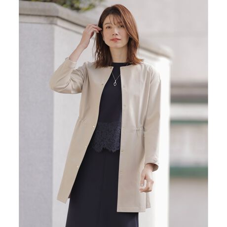 ゆとりのあるAラインシルエットのノーカラーコート。袖口カフスのタブは、奥にゴムを入れた調節可能なタイプです。ウエストは内側にドロストを通すデザインで、ギャザーを寄せて違った表情にアレンジできます。肩幅と身幅をややゆったりとしたサイズ感にしており、インナーのボリューム感をあまり気にする事なく着用できる万能アイテム。フロントのドット釦の開閉も楽にできて気軽に羽織れる、裏地のない仕立ての軽い春コートです。