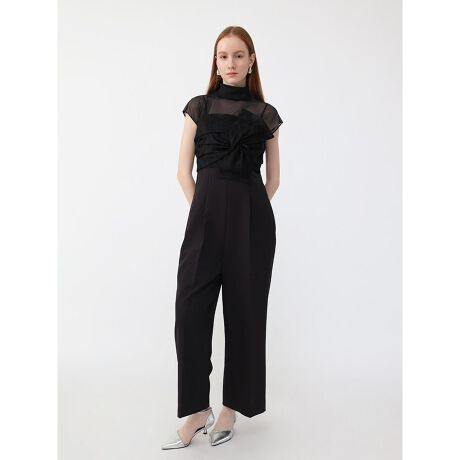胸元の大きなレースリボンをあしらったビスチェデザインが黒の中に華やかさを与えるオールインワン。首元に沿うネックラインがや肩回りのシアー感が大人な抜け感をプラス。切り替え位置の高いウエストからまっすぐに落ちるタック入りのパンツシルエットがスタイルアップを叶え、より洗練された印象へと導きます。