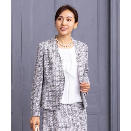 太い糸と細い糸、凹凸のある糸をミックスした表情感のあるツイード素材を使用したジャケット。春夏に向けた薄く軽く、女性らしいピンクを織り込んだ優しいカラーに仕上げています。立ち襟からの深めのVネックが合わせるインナーをさり気なく引き立たせてくれます。また見返しや袖口裏にシャンタン素材を切替えて薄く仕上げています。※同素材商品【スカート:0500208】------------------------------------着用シーズン:春伸縮性:なし透け感:なしポケット:あり生地の厚さ:やや薄手裏地:あり-------------------------------------※商品の色味は、撮影場所や光のあたり具合、お客様のお使いの機器により色味が違って見える場合がございます。予めご了承ください。