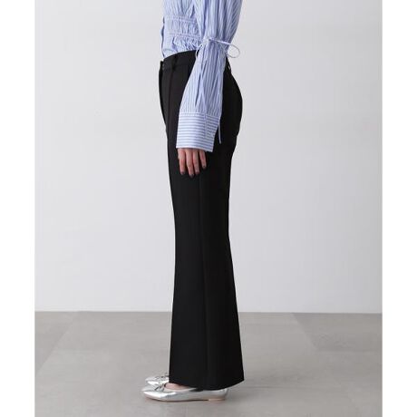 センタープレスで脚をキレイに見せてくれるフレアパンツ。やや膝上でシェイプさせたフレアシルエットで、脚長効果を期待できます。後ろウエストはゴム仕様でフィット感のある穿き心地。ベーシックデザインは上品な印象をキープしながら、オンオフ問わず着用いただけます。