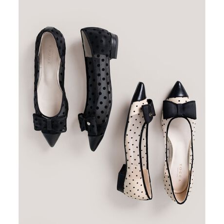 ドットをあしらったチュールや大き目リボンがフェミニンでおしゃれなフラットパンプス。