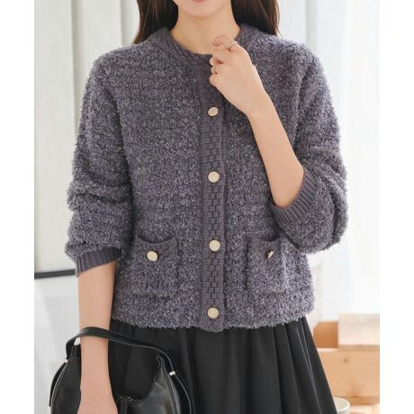 ツイード調に編みこまれた珍しい編地が高見えポイント。