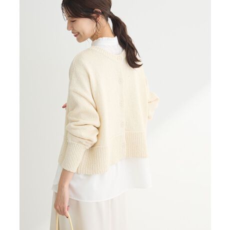 スパングルが編み込まれたブークレヤーンで仕立てたニットプルオーバー。肩落ちラインのゆったりした着心地で、コンパクトな丈感とボリュームスリーブが今年らしい旬なデザインです。前後両A面の2WAY仕様も嬉しいポイント。1枚取り入れるだけで華やかなスタイリングを楽しめるおすすめなアイテムです。透け感[なし]