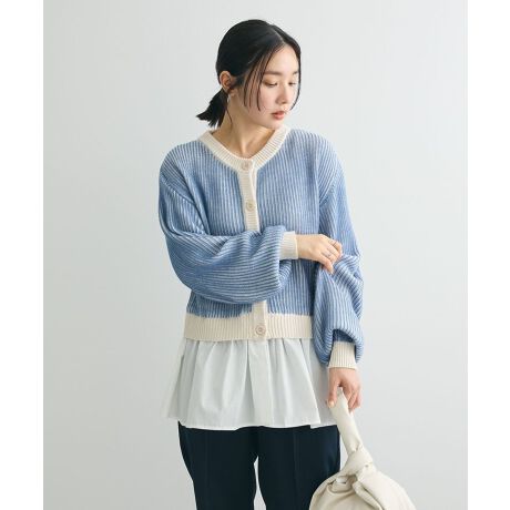 カーディガンとシャツをドッキングしたレイヤード風チュニック。伸び良い配色リブニットが目を惹く爽やかなデザインです。ふんわりと広がるシャツのシルエットがフェミニンなアクセントポイント。1枚取り入れるだけでトレンドライクなスタイリングが楽しめるおすすめなアイテムです。透け感[なし]