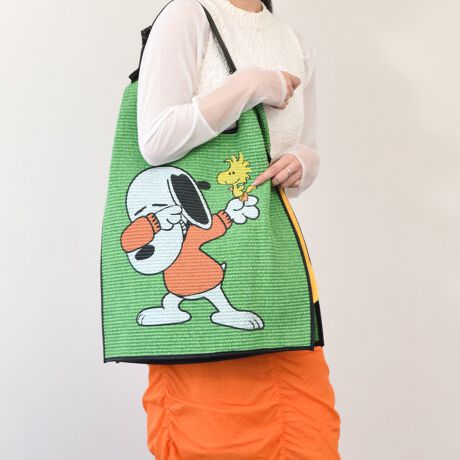 インパクトのあるスヌーピープリントが可愛い、レザーハンドルのラフィアバッグです。