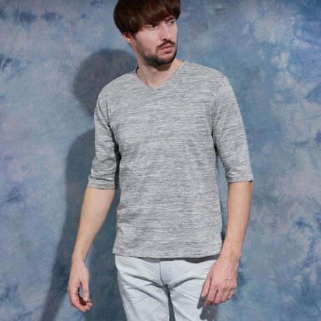 メランジ調の淡い色目が特徴のVネックの5分袖Tシャツ。