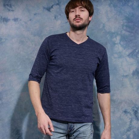 メランジ調の淡い色目が特徴のVネックの5分袖Tシャツ。