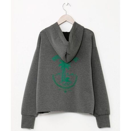 ストレッチ性のあるダンボールニットのフード付きトップス。胸元、袖口、裾、背中の4ヶ所にハワイを感じるデザインのプリントがされています。発泡プリント&フロッキープリントがコーデのアクセントに。