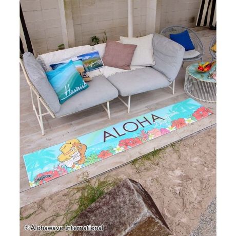 [型番:42UP5104-2025]【Kahiko×Aloha Mapua】サーフィンとファッションをこよなく愛するキャラクター「Aloha Mapua(アロハマプア)」のPVCマット。濡れてもさっと拭けて使いやすく、キッチンカウンター前や廊下におすすめのサイズ。ハワイの海を思わせるデザインで毎日を明るく彩ります。裏面滑り止め加工付き。裏面滑り止め加工