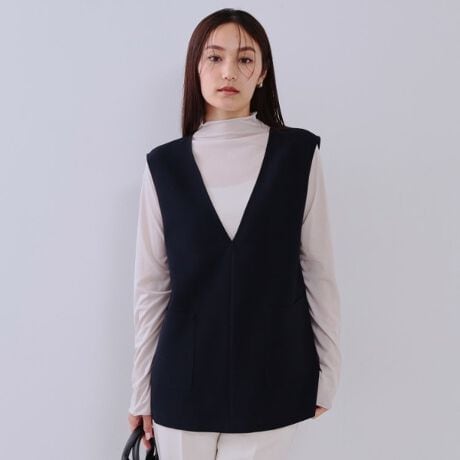 ・ハイネックニットやブラウス、Tシャツなど幅広いトップスに重ね着できる、着回し力の高い一枚です。