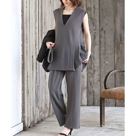 スタイリッシュなベストとパンツのセットアップアイテム。