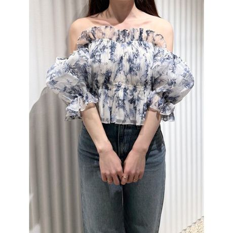 少し透け感のある春トレンドカラーの艶やかなシフォン生地でお作りしたエレガントなギャザーオフショルブラウスです。細やかなプリーツの入ったフリルを襟ぐりやオフショル部分にふんだんにあしらい、デコルテや肩周りを美しく演出します。襟ぐりにはゴムが入ってフィット感があり、着やすいデザインです。胸下もゴムシャーリングでフィット感を出しながら、裾をフレアラインで広げることで、気になるお腹周りもさり気なくカバー。ハイウエストボトムともバランスのとりやすい短めの丈も魅力です。