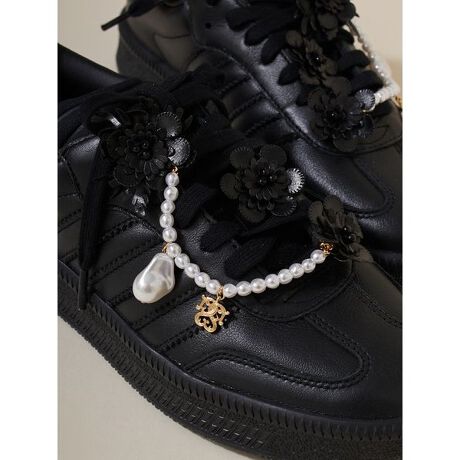 パールビーズを加えてワンカラーでお作りしたレザー風素材の立体的なフラワーモチーフと、艶感のあるパールビーズチェーンがセットになったエレガントなフラワーシューズチャームです。パールビーズチェーンには、SNIDELゴールドロゴチャームやバロックパール風ビーズをポイント使いし、品よく華やかに仕上がりました。装着はクリップ式で簡単にお手持ちの靴紐などに装着いただけます。いつものスニーカーやレースアップシューズ、サンダルなどがパッと華やかにカスタムできるトレンド感のあるアイテムです。ホワイトとブラックの2色展開です。