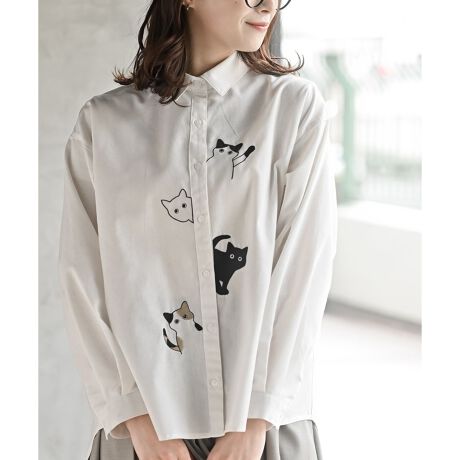 フロントから左右に顔をのぞかせる猫ちゃんの刺繍が可愛いシャツブラウス。