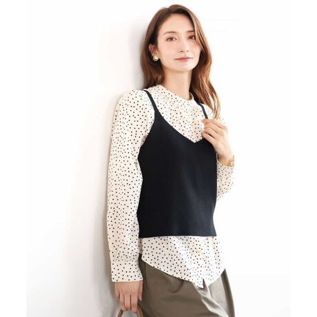ドット柄が目をひくブラウスとレイヤードスタイルに大活躍なニットのビスチェがセットになったアンサンブル。単品でもセットでも使い勝手の良いセットアイテムです。ブラウスはゴールド釦がアクセントのスタンドネックデザインで、衿元のギャザーやスリット入りのカフスデザインがポイントに。