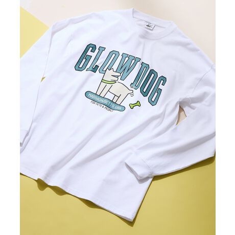 GLOW DOGのカレッジ調ロゴと、可愛らしいドッグモチーフをプリント。