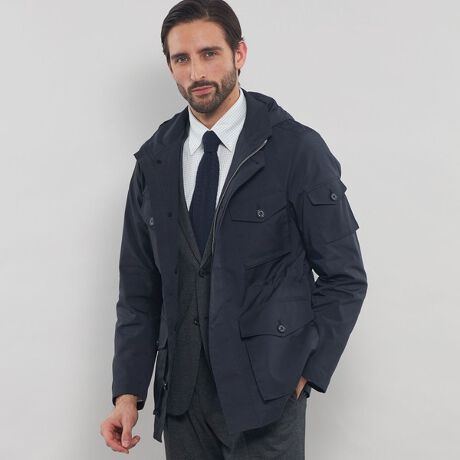 シグニチャーモデル<BERWICK>(バーウィック)。英国陸軍のミリタリーアウターをモチーフとした人気モデルです。コートの様にジャケットの上から羽織ったり、一枚でブルゾンとして着用できる汎用性の高いアウターウェアーです。フードは取り外し可能で、スタンド衿のアウターとしてもご着用頂けます。