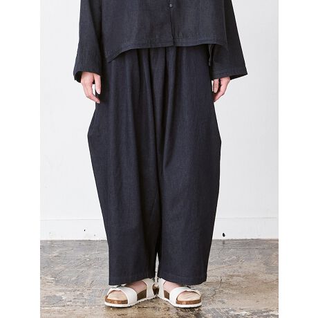 [型番:D3176]・やや薄手で春秋にちょうど良いデニム地・膝のタックで立体的なワイドシルエット・ウエスト総ゴム仕様、内側の紐で調節可能・両サイドにポケットつき