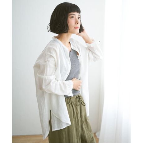 リネンならではの鮮やかな発色が魅力のバンドカラーシャツ。