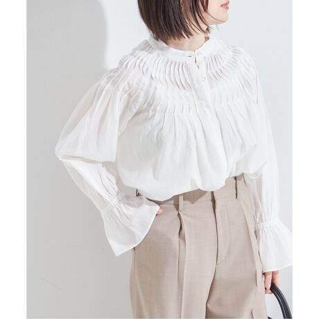 つや感のある生地に贅沢にタックを施したデザインブラウス。