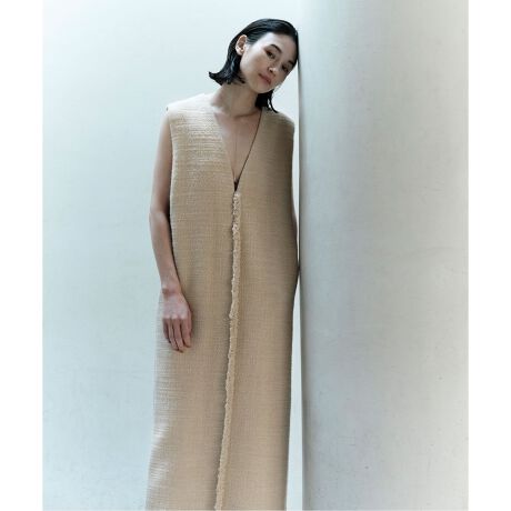 上品さが香るツイード生地をベースにしつつ、深い前下がりのハートネックや踵まで伸びたロング丈といったデザインポイントが際立ち、ワンランク上の着こなしを楽しめる一着。同生地のフリンジは前身頃に入れることでアクセント&スタイルアップを提案。