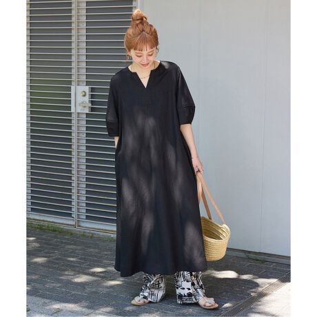 ヨーロピアンフラックスリネンにレーヨン混の落ち感のあるリネン素材のテントラインのワンピース。