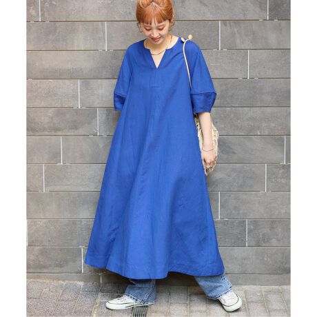 ヨーロピアンフラックスリネンにレーヨン混の落ち感のあるリネン素材のテントラインのワンピース。