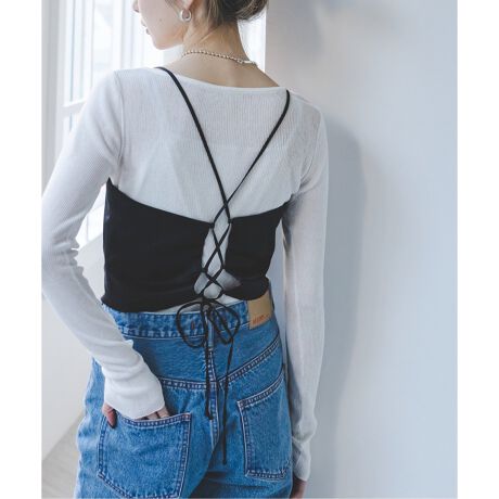 シンプルなフロントに対し、バックはレースアップのデザインを採用しアクセントに。後ろのレースアップを絞ることで身体にフィットするように着用可能で、その分伸縮性のある素材感で仕立てたことで着心地の良さも配慮。
