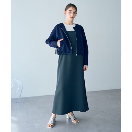 ブルゾンは着心地の良いジャージー素材とチュールの異素材使いでアクセントを付け、ドルマンフォルムで優しい印象に。