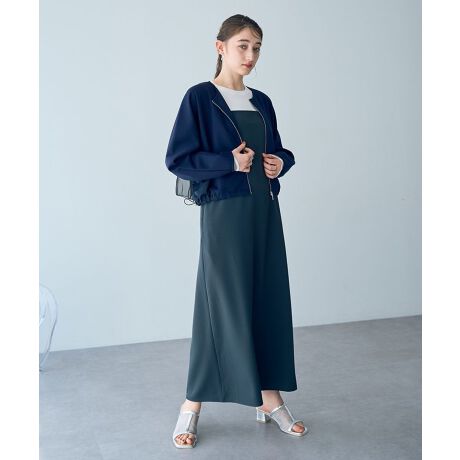 ブルゾンは着心地の良いジャージー素材とチュールの異素材使いでアクセントを付け、ドルマンフォルムで優しい印象に。