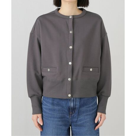 シルバーのスナップボタンとポケットがデザインポイントになって、スウェットでもカジュアルになりすぎない品のある仕上がりになります。