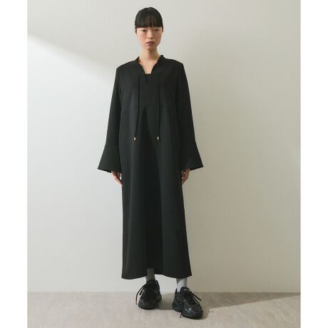 スタンドネックとフロントのスリット開き、程よくフレアに仕上げたカフスがポイントのミニマルなデザインのワンピース。