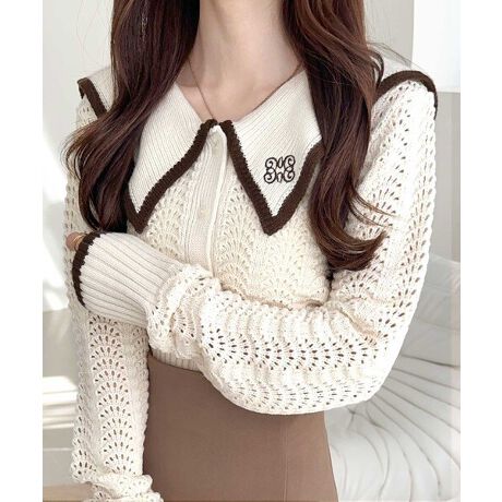 【mily bilet】上品に華やぐ一枚。襟刺繍柄編みビッグ襟ニットポロシャツ(長袖)
