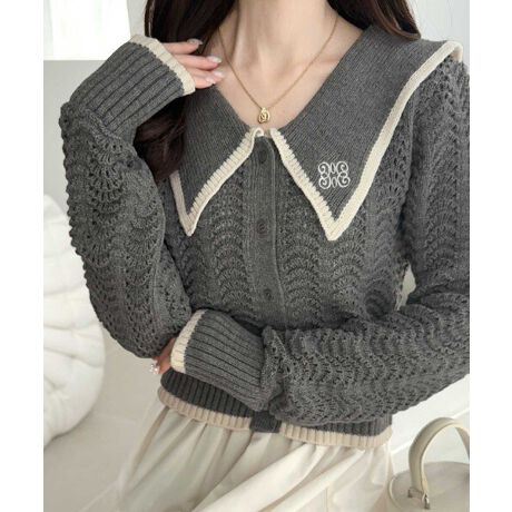 大きくて広い襟がポイントのビックカラーニットカーディガン。