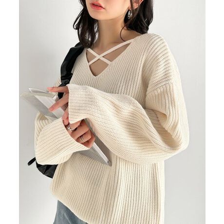 クロスデザインのネックを前にすれば、デコルテを美しく見せ