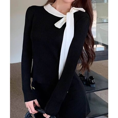 ネックラインのリボンデザインがアクセントになり、エレガントな印象を与えるアイテムです。