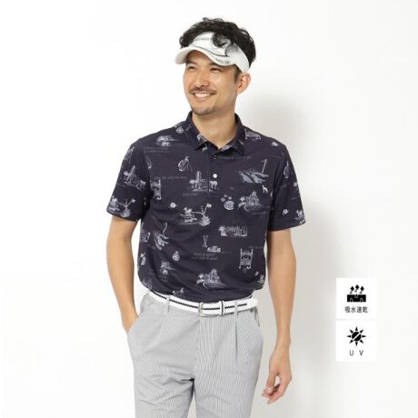 モナコのゴルフマップをスケッチ調で描いた総柄デザインが目を引く半袖ポロシャツ。