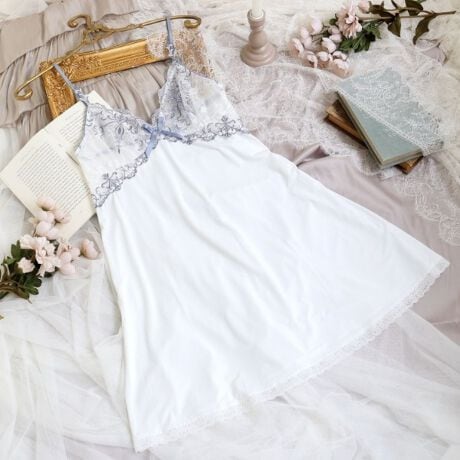 幾何学模様はキラキラと輝く細かなラメ糸で全体を縁取り、その模様とリンクするようなリーフの刺しゅうが、ワントーンの中にも上品な華やかさをプラスしています。裾とバックスタイルには可愛らしい印象の細幅レースを、ストラップには幾何学模様とリーフを合わせたお揃いのアップリケをあしらいました。