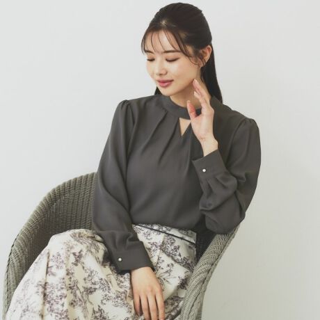 ・ハイネックにスリットネックのデザインが顔周りをスッキリと見せ、エレガントな印象を与えます。