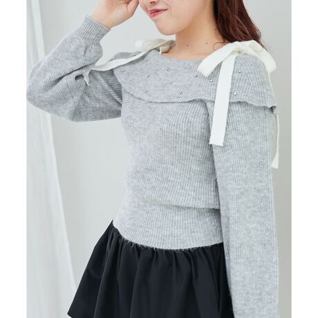襟部分にビジューをたっぷりと装飾し、華やかな印象に仕上げたフェミニンニット。