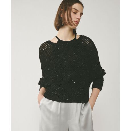抜け感コーデを楽しむ、大人のメッシュニットトップス。毛足のある糸でざっくりと編み立てたボディにドロップショルダーのルーズなシルエットが、ヘルシー&ニュアンス感のある春の装いを叶えます。スパンコールを織り交ぜた華やかな表情が、洗練された大人のフェミニンなスタイルにぴったり。