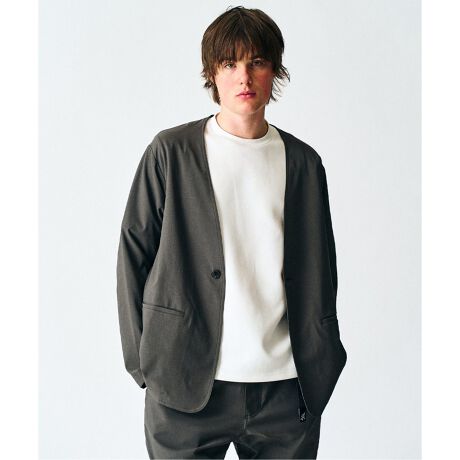ドライタッチ、ウォッシャブルでイージーケア。ゆったりとしたシルエットのノーカラージャケットです。