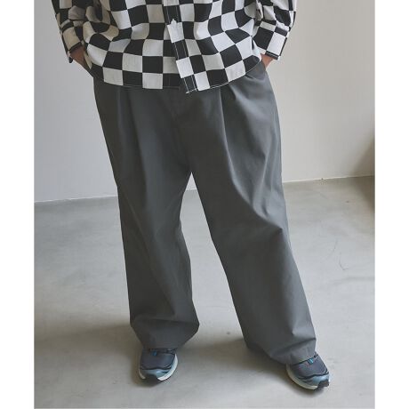 フロントのクロスした2本のタックが、シンプルな中にもさりげない個性を演出します。ゆったりとしたワイドシルエットは、体型を気にせず快適な着心地。