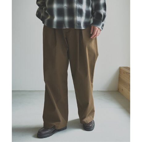 フロントのクロスした2本のタックが、シンプルな中にもさりげない個性を演出します。ゆったりとしたワイドシルエットは、体型を気にせず快適な着心地。