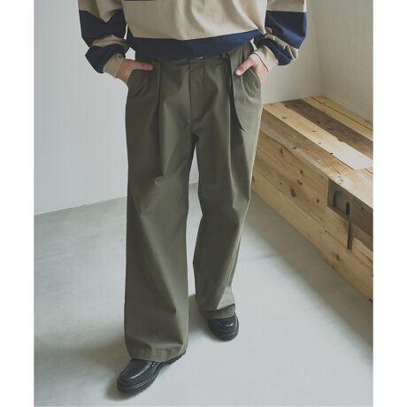 フロントのクロスした2本のタックが、シンプルな中にもさりげない個性を演出します。ゆったりとしたワイドシルエットは、体型を気にせず快適な着心地。