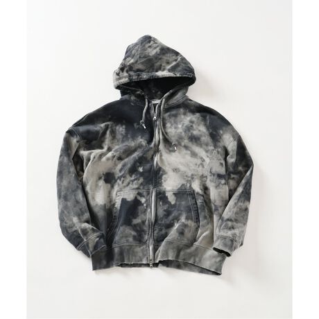 ヴィンテージのような風合いが魅力のブラックブリーチパーカー。大胆なダメージ加工と、アートのようなブリーチの色味が特徴です。