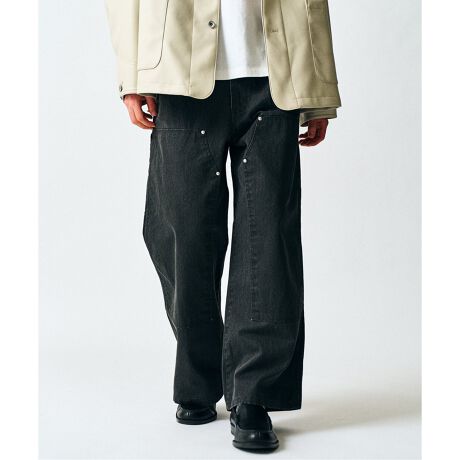 ダブルニー型の重厚なワークパンツ型で腰回りはスッキリと、裾に向かってズドンと太いワイドパンツ。ウエストはサイズ調整できるので女性にもオススメのパンツです。